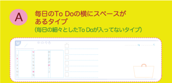 【A】と【B】がありますが、違いは【A】は毎日のTo Doの横のスペースがやや広めで、【B】は毎日のTo Doの横に、さらに日々の細々としたTo Do記入欄があることです。